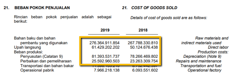 Menurut LK 2019, bahan baku menjadi penyumbang terbesar Beban Pokok Penjualan yaitu sebesar 58.44%, disusul biaya penyusutan dan pemeliharaan sebesar 22.62%, dan upah langsung sebesar 17.21%.