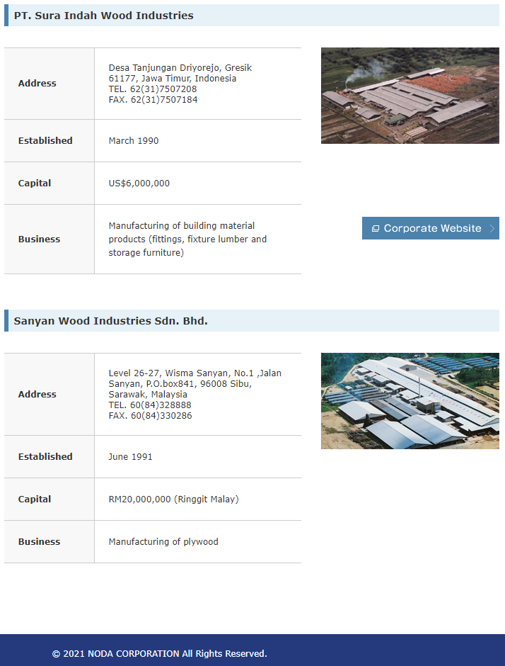 Noda Corporation, menurut situs resmi perusahaan, ternyata memiliki perusahaan di Indonesia yang juga bergerak di bisnis hasil olahan kayu yaitu di PT. Sura Indah Wood Industries. Perusahaan ini berdiri tahun 1990. Jadi bisa dibilang salah satu pemain lama industri kayu di Indonesia.