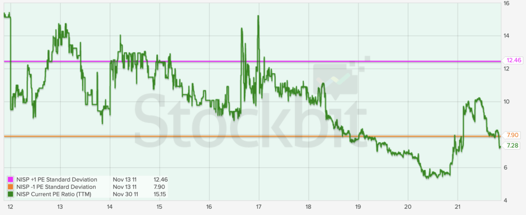 Mengutip stockbit, PER NISP saat ini berada di kisaran 7.28X dan berada di bawah -1 Standar Deviasinya. Artinya secara analisa PER sederhana saat ini, harga saham NISP bisa dikatakan cukup murah.