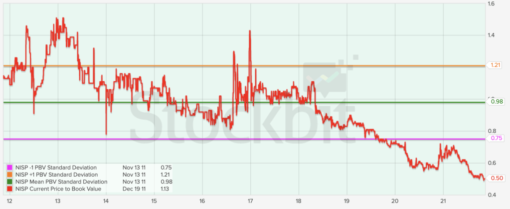 Dari segi PBV, saham NISP juga bisa dibilang undervalue. Saat artikel ini ditulis, NISP memiliki PBV sebesar 0.5X. Angka ini berada di bawah -1 standar deviasinya.